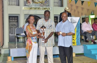 BOB CUP WINNER – Anniffa Curtis, Officer-in-Charge of BOB’s Exuma Branch and Minister of Tourism the Hon. Obie Wilchcombe present the BOB cup to Lloyd Sands, first place winner in the “E Class” senior division race.