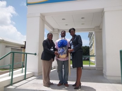 IT PAYS TO BE HONEST – BOB Customer Deron Russell (centre) received a gift basket after returning ATM funds left by another customer. The basket was presented by Thompson Boulevard Branch Manager Berthia Knowles and Assistant Branch Manager Antoinette Brennan.